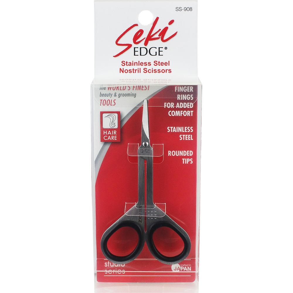 Seki Edge Stainless Steel Nostril Scissors. Safe, effective, and precise, the Seki Edge Stainless Steel Nostril Scissors are designed to make facial hair grooming both easy and comfortable. Made in Japan from twice-tempered stainless steel, these scissors provide sharp, hand-finished cutting edges that trim cleanly without pulling or snagging. Their rounded tips and short blades are specially crafted to navigate sensitive areas such as the inner part of the nose, ensuring safety while delivering professional-quality results. Whether for nostril hair or other delicate facial hair, these scissors are a reliable grooming essential.