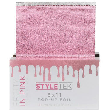 StyleTek Colored Pop-Up Foil- 5" x 11" - 500 Sheets - Heavy Emboss - In Pink. Professional foil made specifically for all hair coloring techniques and services. Heavy desert sand embossed texture. Unique dot pattern to lock heat transfer. For all coloring techniques. Pre-folded pop up foil. Slides out easy for quick foiling. Extra thick for no tear foiling session. No slip, ultimate grip. Packaging easily turns into dispensing box. 500 Sheets. 5" x 11"