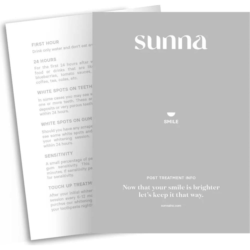 Sunna Smile Post Care Cards - 25 Pack. Embark on a journey of unparalleled care and customer satisfaction with the Sunna Smile Post Care Cards. Designed to enhance your clients' teeth whitening experience, these cards are a vital addition to your post-treatment service, ensuring clients achieve the brightest, healthiest smiles. A simple yet powerful way to extend your professional touch, these cards not only guide clients on essential aftercare steps but also build loyalty by offering clear instructions for maintaining their results.