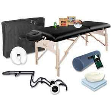 Table With The Works Package. Everything a therapist needs to begin their career, or give their practice a boost, can be found in this incredible package. This package has it all, from the massage table you need, to the massage creams, oils and lotions you will use. This all inclusive offer includes everything you see for one phenomenally low price. Upgrade your package to include our NRG Karma table with rounded corners, and thicker foam for only $50.00 more.