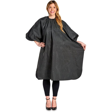 Techno Vinyl Shampoo Cape with Stay-Dry Back Guard. Black. Soft, lightweight and durable techno vinyl shampoo cape with extra protective back panel to keep clients dry. Waterproof and stain resistant. Measures 44-1/2" W x 60" L.
