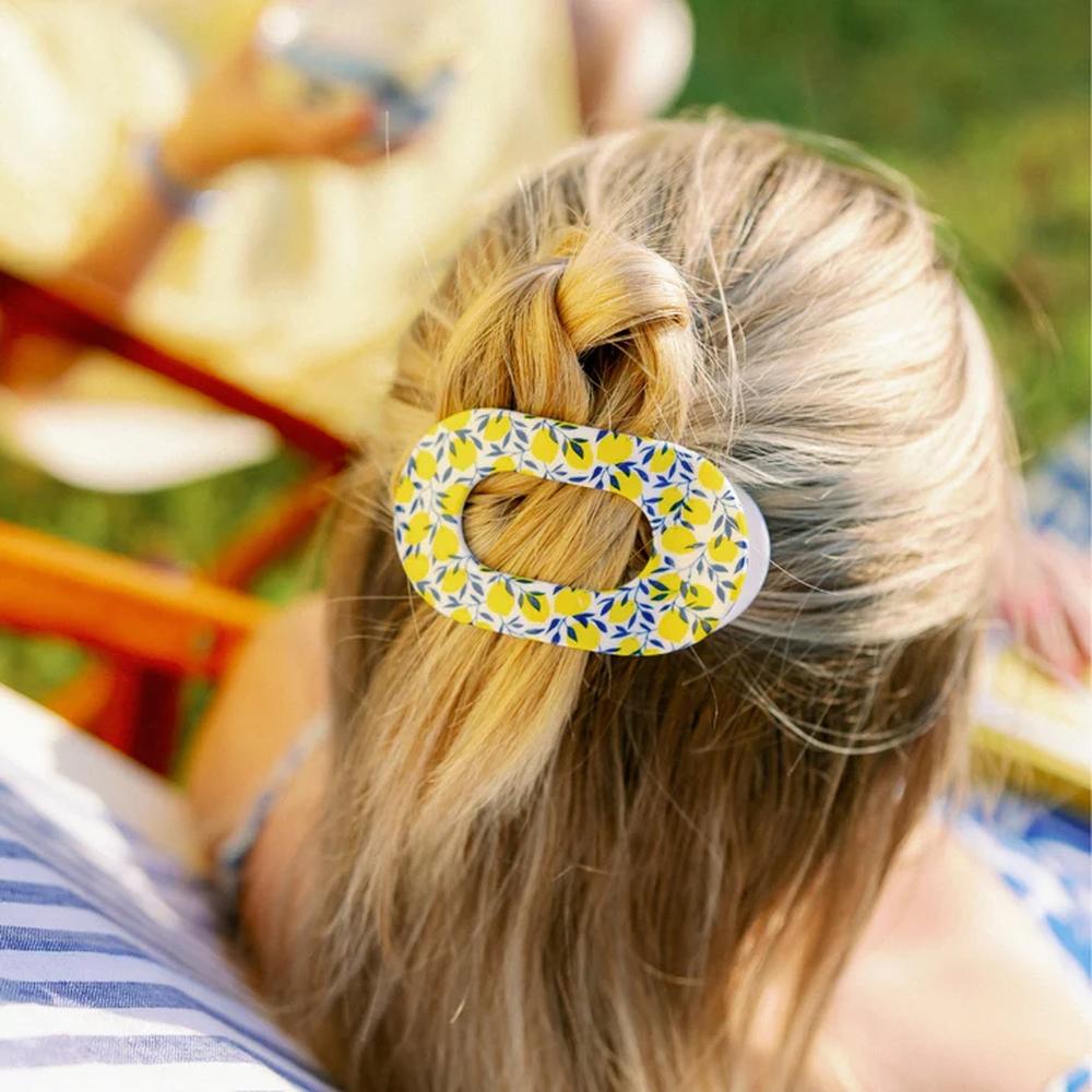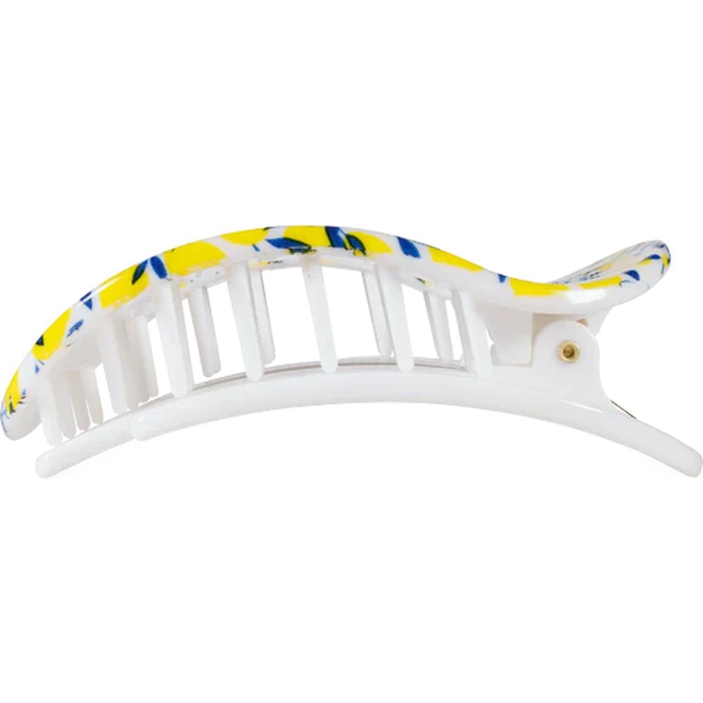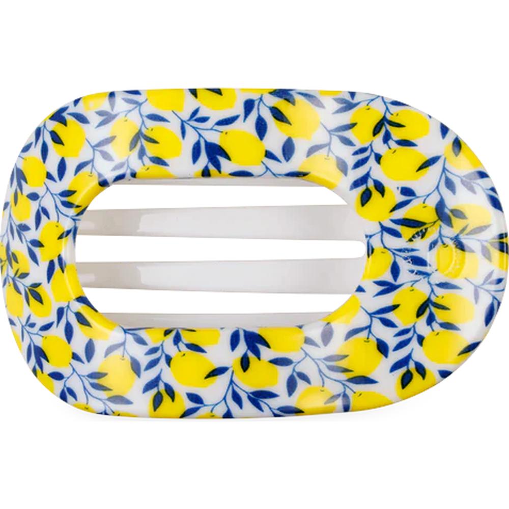 Teleties Flat Limoncello Hair Clip Large. Embark on a voyage of elegance and exceptional design with the Teleties Flat Limoncello Hair Clip Large. Crafted to keep your hair in place while adding a refreshing burst of color, this chic accessory redefines functionality and style in one. No longer do you need to choose between form and function. This beautifully designed clip effortlessly secures your hair without causing damage or discomfort, so you can go about your day with confidence and ease. The lively lemon-inspired design is a playful addition to any look, whether you're hosting a spa day or preparing for a busy day at the salon.
