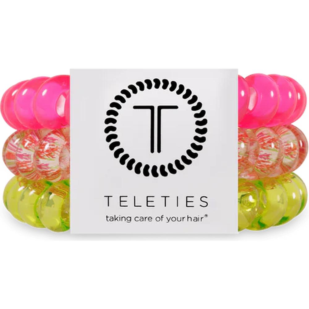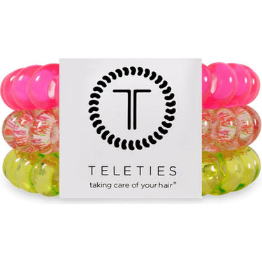As a professional in the beauty industry, you understand the importance of using high-quality products that meet the demands of your clients. Teleties Large 3 Pack Tropical Punch offers a strong, reliable hold that lasts through long workdays without the discomfort or damage caused by traditional hair ties. Whether you're using these ties in a salon setting or retailing them to your clients, the value they bring is undeniable. The waterproof and durable nature of these ties means they will perform under various conditions, whether your clients are at the gym, at the beach, or out for a night on the town.