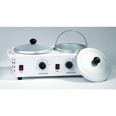 The Orla Double Wax Warmer. Convenient warmer melts double the amount of wax at one time. Includes 2 removable wax pots with handles and features 2 separate heating units with thermostat controls to heat one or both pots at the same time. Each pot has a lid to seal in heat and can hold an 8 oz. or 14 oz. can of wax. Heat adiusts up to a maximum temperature of 80°C.
