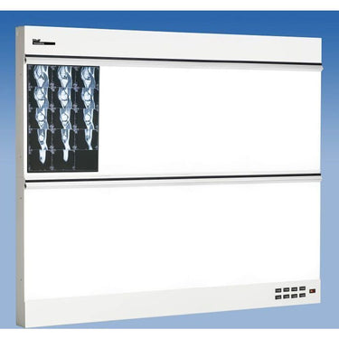The Trimline Illuminator / 4 over 4 by Wolf X-Ray. The Trimline illuminator 4 over 4 features four viewing boxes on top of four viewing boxes. Each viewing area has 2 bulbs (2,200 Candela per square meter) per each 14" x 17" viewing area. Total viewing area is 56" x 34."