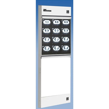 The Trimline Plus Hi-Lo Illuminator / 1 over 1 (6 Bulb) by Wolf X-Ray. The Trimline Plus Hi-Lo 1 over 1 Illuminator provides two light intensities per each 14 x 17 viewing area. You can go from 5,150 to 7,250 Candela per square meter at the push of a button. Illumination is from 6 lamps in high intensity, to four lamps in low intensity.