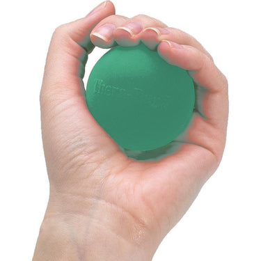 Thera-Band Hand Exerciser 26040 Green Medium. Thera-Band Hand Exerciser Green, medium, 5 lbs* Unique strengthening and rehabilitation device. Great for improving grip, dexterity and mobility. Can be used for hot or cold therapy. Available in four or five color-coded levels of resistance. Instructions included.