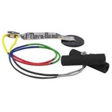 Thera-Band Shoulder Pulley. The new Thera-Band Shoulder Pulley has an innovative sectioned rope and features the Thera-Band colors you know and recognize. This unique attribute provides patients immediate feedback on progress. As they move through the sections, they can literally see how much their ROM is improving! And clinicians have an easy way of directing patients. Simply use the marks to communicate how far you want them to extend / where youd like for them to stop. The pulley can be anchored at any point along a standard door jamb for ease of use. The adjustable rope length offers custom fit and versatility and the soft foam handles provide superior comfort during use. Professional retail packaging and clear safety / use instructions enhance sell-through for home use. The pulley is also available in bulk for clinics with high-volume use.