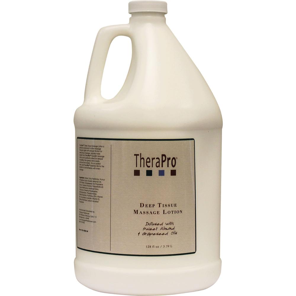 Therapro Deep Tissue Lotion / 1 Gallon. TheraPro Deep Tissue Massage Lotion is a perfectly balanced product that offers the massage therapists glide with enough friction for Deep Tissue massage. This lotion absorbs more rapidly than TheraPro Swedish Massage Lotion and is perfectly suited for deeper modalities. TheraPro Deep Tissue lotion is non-greasy and easily removed from sheets for easy cleanup. It washes completely out of linens leaving no stains or undesirable odors. For an added treat you can add TheraPro essential oil blends for the benefits of aromatherapy. Water dispersible. Available in 8 oz bottle, and 1/2 gal, 1 gal, and 5 gal containers. Please note: Pumps sold separately.