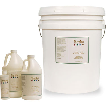 Therapro Deep Tissue Lotion / 64 oz. TheraPro Deep Tissue Massage Lotion is a perfectly balanced product that offers the massage therapists glide with enough friction for Deep Tissue massage. This lotion absorbs more rapidly than TheraPro Swedish Massage Lotion and is perfectly suited for deeper modalities. TheraPro Deep Tissue lotion is non-greasy and easily removed from sheets for easy cleanup. It washes completely out of linens leaving no stains or undesirable odors. For an added treat you can add TheraPro essential oil blends for the benefits of aromatherapy. Water dispersible. Available in 8 oz bottle, and 1/2 gal, 1 gal, and 5 gal containers. Please note: Pumps sold separately.