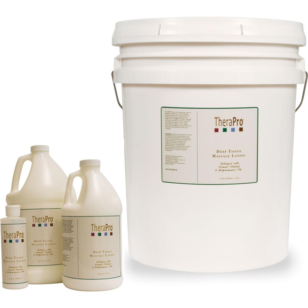 Therapro Deep Tissue Lotion / 8 oz. TheraPro Deep Tissue Massage Lotion is a perfectly balanced product that offers the massage therapists glide with enough friction for Deep Tissue massage. This lotion absorbs more rapidly than TheraPro Swedish Massage Lotion and is perfectly suited for deeper modalities. TheraPro Deep Tissue lotion is non-greasy and easily removed from sheets for easy cleanup. It washes completely out of linens leaving no stains or undesirable odors. For an added treat you can add TheraPro essential oil blends for the benefits of aromatherapy. Water dispersible. Available in 8 oz bottle, and 1/2 gal, 1 gal, and 5 gal containers. Please note: Pumps sold separately.