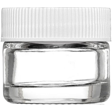 Thick Walled Clear Glass Sampling Jar - White Threaded Cap with Liner - 5 Gram - 5 mL. - 0.17 oz. / 250 Assembled Jars. Sample or store various product formulas in these glass 5 gram jars that feature threaded caps and Polyethylene cap liners.