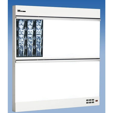 Trimline III Illuminator / 3 over 3 (3 Bulb) by Wolf X-Ray. The Trimline III Illuminator 3 over 3 features three viewing boxes on top of three viewing boxes. Each viewing area has 3 bulbs (4,000 Candela per square meter of illumination) per 14" by 17" viewing area. Total viewing area is 34" x 42."