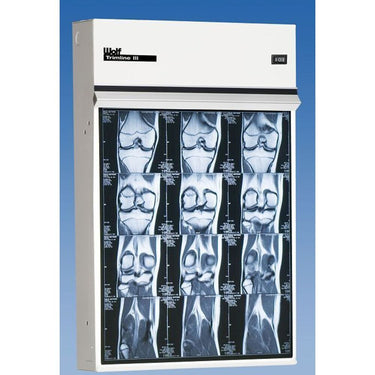 Trimline III Illuminator / Standard 14" x 17" (3 Bulb) by Wolf X-Ray. The Trimline III Illuminator features 3 bulbs (4,000 Candela per square meter of illumination) per 14" by 17" viewing area).Has all the standard Trimline family features: viewing areas from 14" x 17" up to 2 tiers of 84" x 17" , film activated auto switches (on 2 over 2 units and up), and a roller grip film retainer, all in a sleek cabinet finished in white baked on enamel.