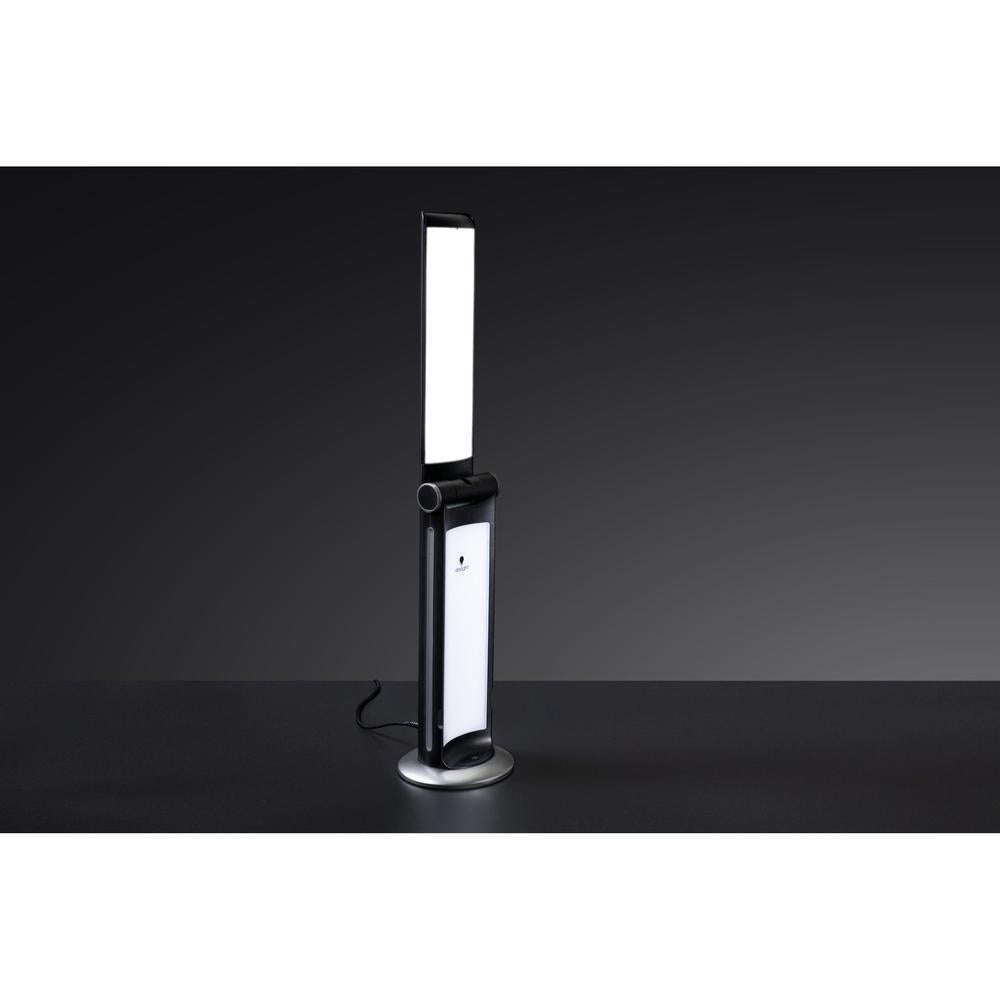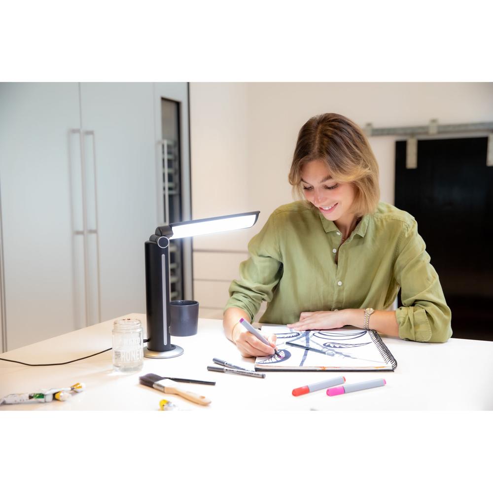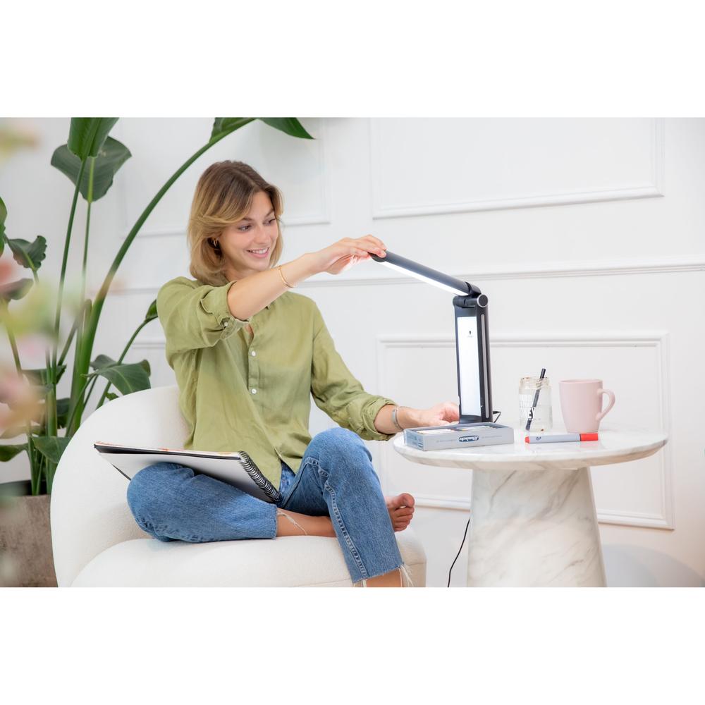 With its lightweight and ergonomic build, the TwoSun lamp is easy to carry with one hand and can be conveniently moved from room to room. The sleek black and silver design complements any interior, making it a stylish yet functional addition to your home or workspace. When not in use, the lamp folds compactly, taking up minimal space.