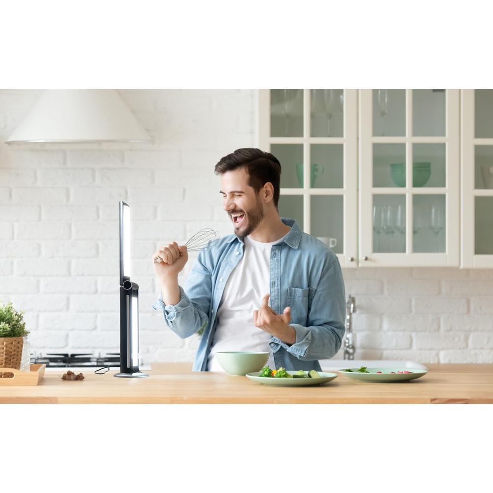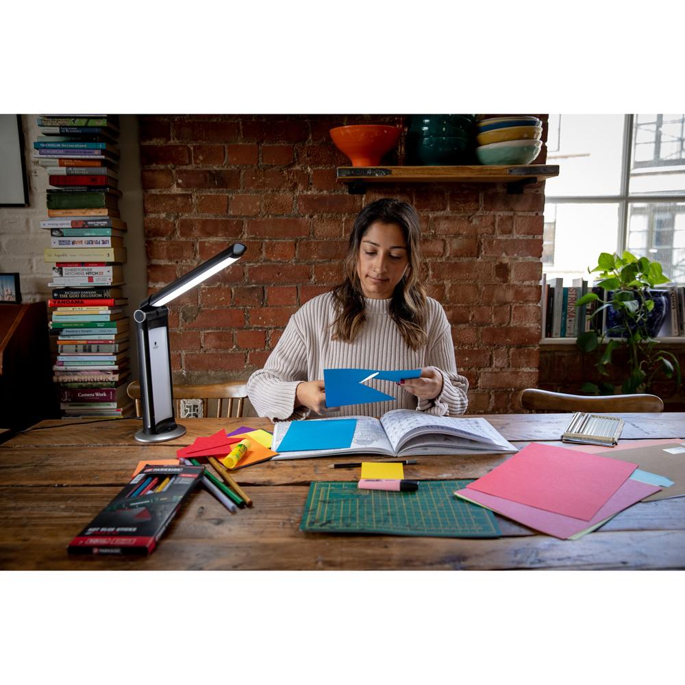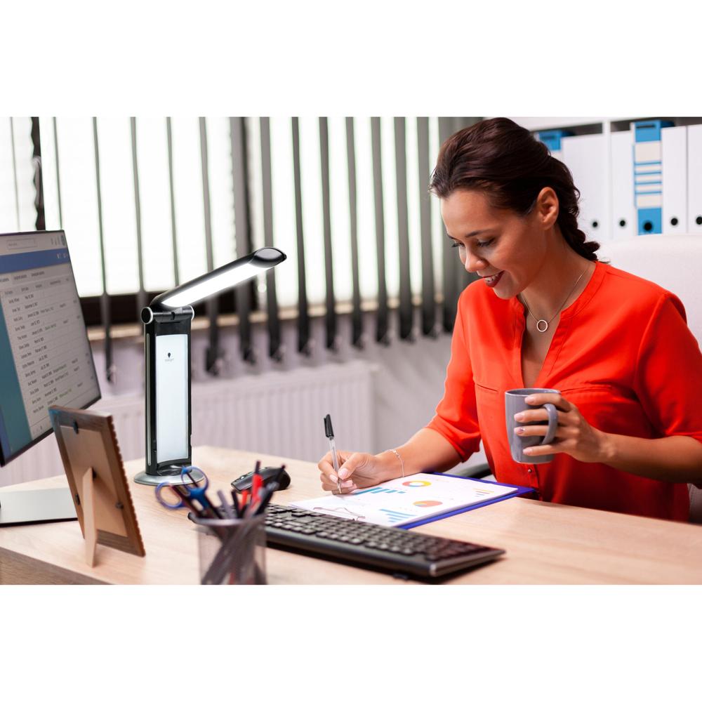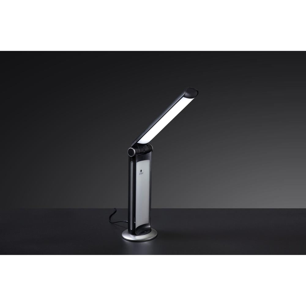 With its lightweight and ergonomic build, the TwoSun lamp is easy to carry with one hand and can be conveniently moved from room to room. The sleek black and silver design complements any interior, making it a stylish yet functional addition to your home or workspace. When not in use, the lamp folds compactly, taking up minimal space.