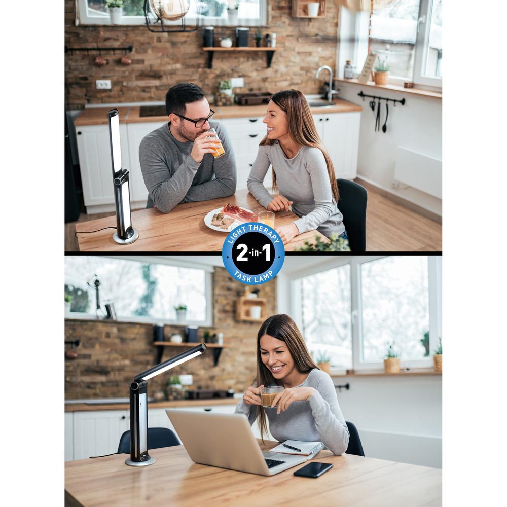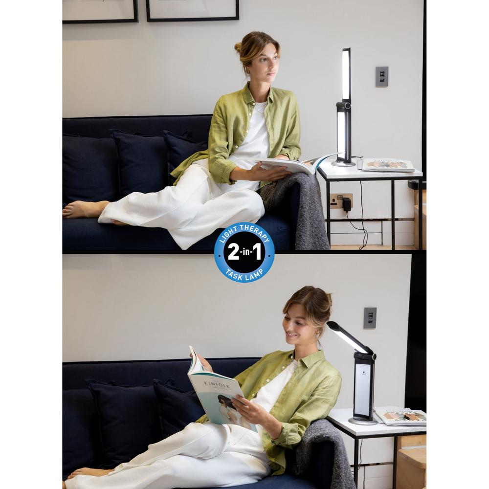 Brighten Your Day with the TwoSun Therapy & Task Lamp. Say goodbye to winter blues and symptoms of Seasonal Affective Disorder (SAD) with the TwoSun, a versatile 2-in-1 light therapy and task lamp. Ergonomically designed to offer comfort and convenience, this lamp is a game-changer for those needing an energy boost or improved focus. Its lightweight and portable build make it perfect for home or office use, while the foldable design ensures easy storage when not in use.