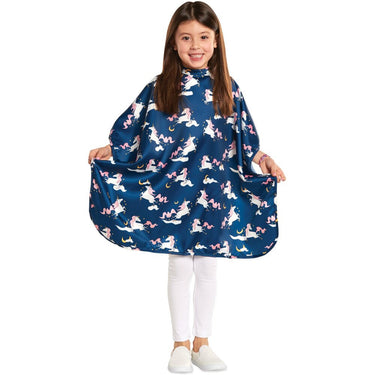 Unicorn Kiddie Cape / 29" x 36". 100% premium polyester kiddie cape features an on trend unicorn pattern. This lightweight cape is water-resistant, static-free, and machine washable. Snap neck closure. Measures 29" x 36".