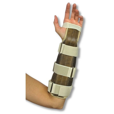 Universal sizing is created by a two-piece splint. "Breathable" perforated vinyl laminated to 3⁄8" thick foam and nylon tricot. Fits left or right hand. 11" long. Preshaped removable stays. Fits approximate palm width of 2" - 4".
