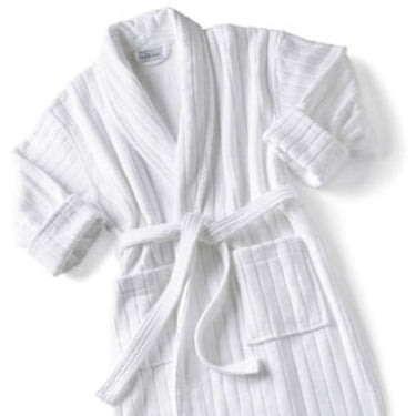 Velour Stripe Bathrobe – White by Boca Terry. Wrap your clients in the pinnacle of luxury with the Velour Stripe Bathrobe by Boca Terry. Crafted from 100% combed cotton velour, this robe is more than just a piece of spa attire—it's an experience of unmatched comfort and elegance. Perfectly designed for professionals who prioritize client satisfaction, this robe combines style, functionality, and durability in every fiber.