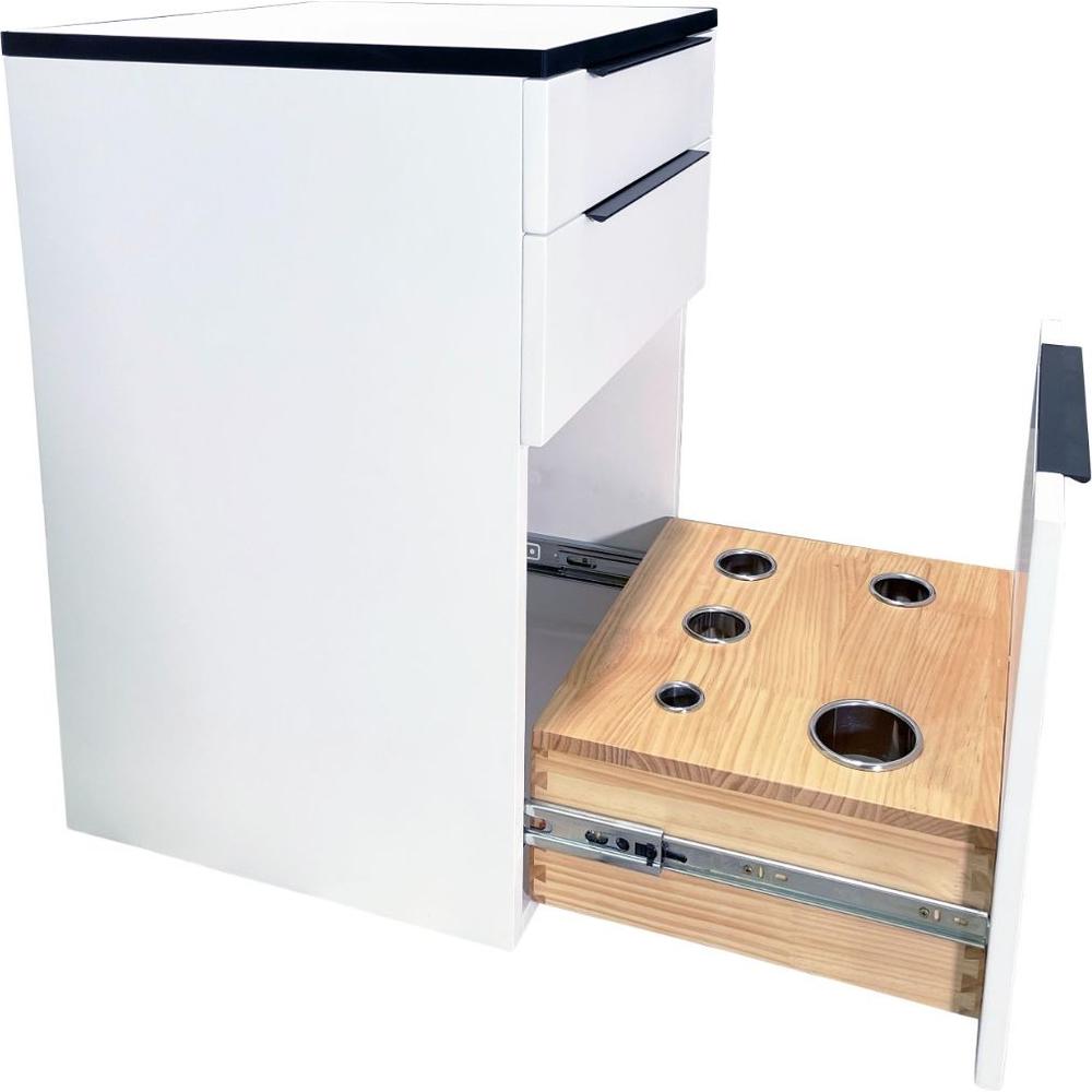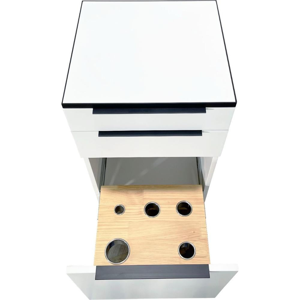 Elevate your salon’s efficiency and aesthetics with the Vitani Wall-Mount Styling Station Cabinet in White by Deco Salon Furniture. This premium cabinet merges sleek modern design with robust functionality, crafted from solid wood and accented with brushed steel for a polished, professional look. Featuring two spacious storage drawers and a pull-out tool holder, it optimizes organization while saving valuable floor space. Fully assembled and ready to install, the Vitani cabinet is a seamless addition to any salon seeking a blend of luxury, durability, and smart storage solutions. Its crisp white finish complements contemporary decor, making it a standout choice for stylists who value style and practicality.