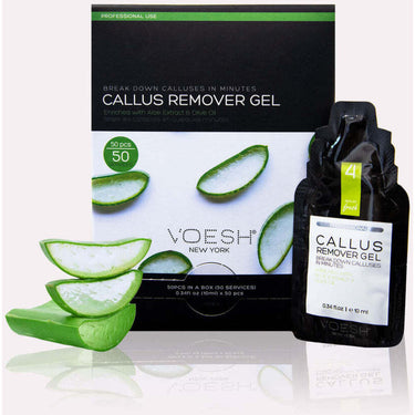 Voesh Deluxe Pedicure Callus Remover Gel / 10 grams - 0.35 oz. Each - Case of 50 Single Use Packs by Voesh of New York. Break down calluses in minutes. This AHA and BHA-infused gel helps exfoliate dead skin cells faster and is incredibly effective. Enriched with aloe extract and organic olive oil to soothe and relieve extremely dry skin and cracked heels. The single-use pouch is designed with a dispenser tip for no-spill, no drip, and easy application. Available as open stock or in convenient 50 pack case boxes.