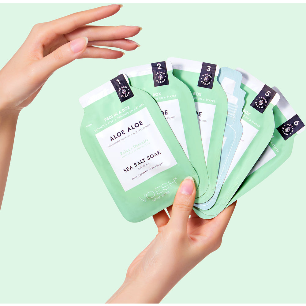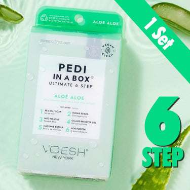 Voesh Ultimate Pedicure in a Box - 6-Step Hygienic Spa Pedicure Kit - Aloe Aloe / 1 Treatment Set by Voesh of New York. Voeshs Aloe Aloe individual spa pedicure collection is a six-step treatment that enriches skin with key ingredients to give feet much needed nutrients. Each set is individually packed with the right amount of product for a single pedicure, ensuring a clean and hygienic spa pedicure solution. Each set includes a Sea Salt Soak, Sugar Scrub, Mud Mask, Massage Lotion, Callus Remover, and Finishing Moisturizer. Available in a 1 Pack and a 30 Pack Case. Available in Aloe Aloe and Milk & Honey.