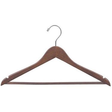Walnut Hanger With Pants Bar And Chrome Accents / 5 Pack. Beautiful, flat walnut robe hanger comes with a chrome hook and notches in the shoulders for hanging straps. The pant bar is made of wood and is very sturdy. These hangers are stained in a rich walnut color and coated in clear lacquer for durability. Perfect for use in locker rooms, waiting areas or treatment rooms. Pack of 5.
