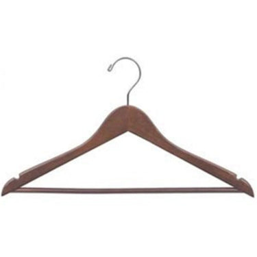 Walnut Hanger With Pants Bar And Chrome Accents. Beautiful, flat walnut robe hanger comes with a chrome hook and notches in the shoulders for hanging straps. The pant bar is made of wood and is very sturdy. These hangers are stained in a rich walnut color and coated in clear lacquer for durability. Perfect for use in locker rooms, waiting areas or treatment rooms. Sold individually.
