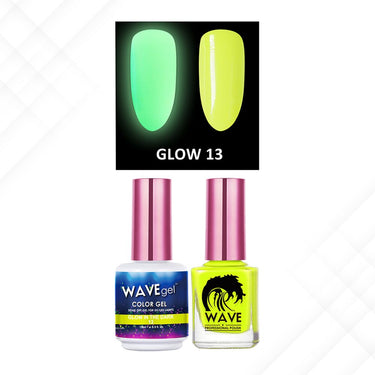 Wave Glow 2-In-1 Matching Duo Set / 1 Gel Polish 0.5 oz. + 1 Lacquer 0.5 oz. / #13 by WaveGel. Featuring the latest gel and lacquer formulas, Wave Glow Gel glows inthe dark and is the premier professionals choice for Gel Polish and Nail Lacquer. All Wave Gel Colors come with a companion nail lacquer.
