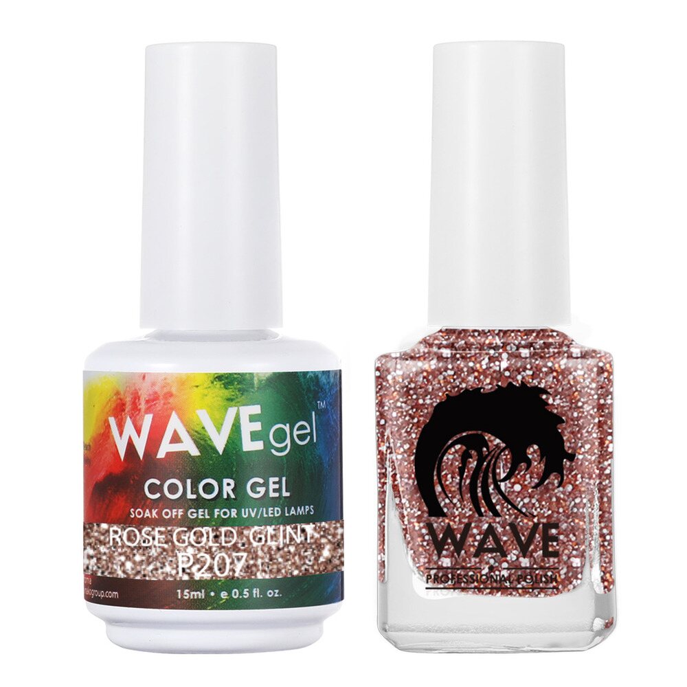 Wave Simplicity Collection 2-In-1 Matching Duo Set / 1 Gel Polish 0.5 oz. + 1 Lacquer 0.5 oz. / #P207 Rose Gold Glint by WaveGel. Wave Simplicity Collection 2-In-1 Matching Duo Set / 1 Gel Polish 0.5 oz. + 1 Lacquer 0.5 oz. / #P207 Rose Gold Glint. Featuring the latest gel and lacquer formulas, Wave Glow Gel glows inthe dark and is the premier professionals choice for Gel Polish and Nail Lacquer. All Wave Gel Colors come with a companion nail lacquer.