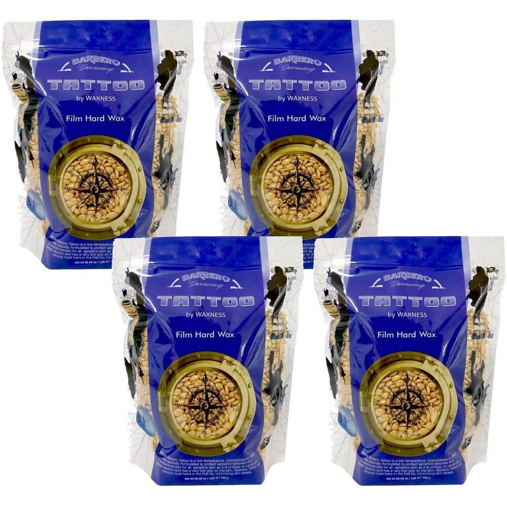 Waxness Barbero Tattoo Hypoallergenic Gold Film Hard Wax Beads - Made in Italy / 1.65 lbs. - 750 grams Eax X 4 Bags = 6.6 lbs. Waxness Barbero Tattoo is a low temperature, hypoallergenic, creamy wax specially formulated to protect sensitive tattooed skin.< It is recommended for all sensitive skin as it is unlikely to cause any allergic reaction and has a very low grip on the skin. Barbero Tattoo will remove most hairs in the first try, minimizing skin stress.