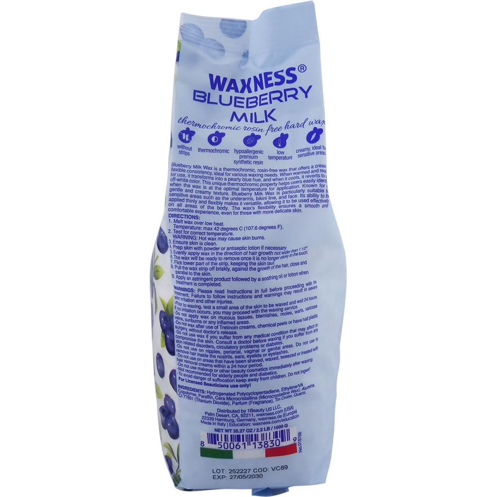 Blueberry Milk Thermochromic Rosin Free Hard Wax Bulk 22 lb / 10 kg. Immerse your clients in an unparalleled waxing experience with Blueberry Milk Wax, a unique thermochromic, rosin-free formula that delivers optimal performance for sensitive areas. As the wax warms, it transforms into a beautiful pearly blue hue, and once it cools, it reverts to an off-white color. This temperature-sensitive property ensures that you apply the wax at its ideal consistency, reducing guesswork and improving precision during treatments. Known for its creamy and flexible texture, Blueberry Milk Wax is perfect for delicate skin, including the underarms, bikini line, and face.