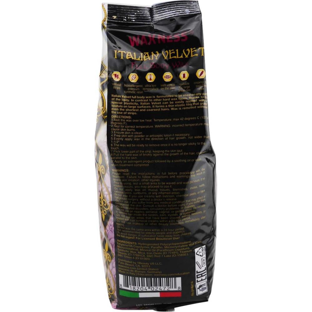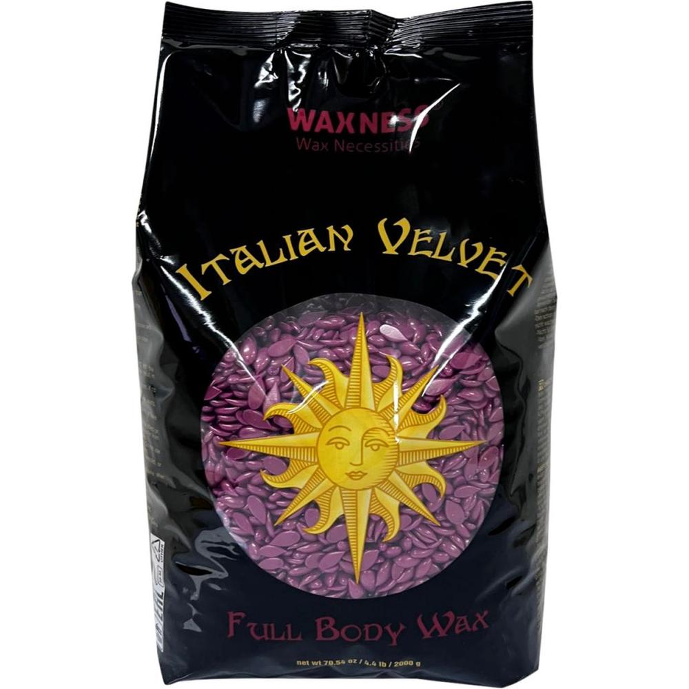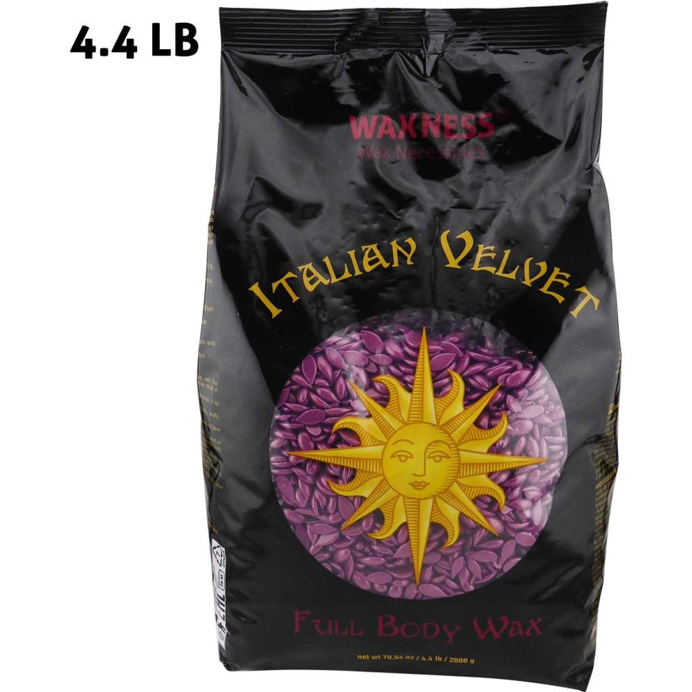 Italian Velvet Full Body Hard Wax Beads 8.8 Lbs. When it comes to waxing, professionals know that choosing the right product can make all the difference. The Waxness Italian Velvet Full Body Hard Wax is designed to meet the needs of high-end salons and spas that require superior performance with every use. This wax is formulated with additional pliability, making it easy to apply on large surfaces with a spatula. Its smooth, elastic texture creates a thin, even layer that grips even the toughest hairs, no matter the length. And with its strip-free formula, you get flawless results without any hassle.