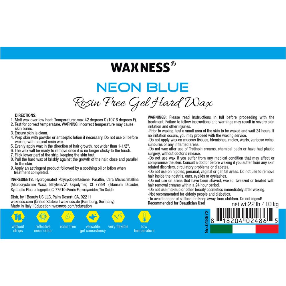 Neon Series Blue Rosin Free Gel Hard Wax Bulk 22 Lb / 10Kg. Step into a new level of waxing excellence with the Waxness Neon Series Blue Rosin Free Gel Hard Wax — the ultimate choice for spas and salons that demand performance, consistency, and a little flair in their waxing services. This professional-grade depilatory wax is designed for speed, precision, and client comfort, making it a must-have for any busy waxing studio. Its mesmerizing neon blue hue not only adds a pop of fun to your wax station but also signals innovation — a wax that looks as good as it performs.