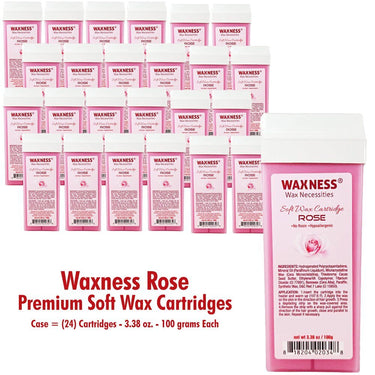 Waxness Rose Soft Wax Cartridge / Case = (24) Cartridges - 3.38 oz. - 100 grams Each. Waxness Rose Soft Wax Cartridge. High-density wax. High titanium dioxideconcentration wax, characterized by advanced adhesion. formulated for removal of short, coarse hair. Characterized by advanced adhesion level. Non-transparent.