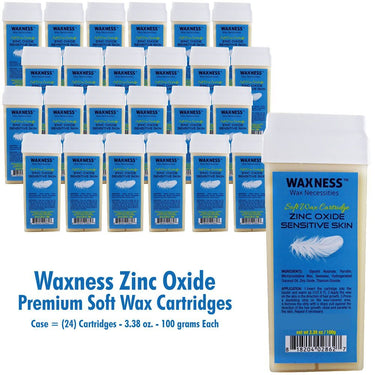 Waxness Zinc Oxide Sensitive Skin Soft Wax Cartridge / Case = (24) Cartridges - 3.38 oz. - 100 grams Each. Waxness Zinc Oxide has a zinc oxide formula, giving wax special properties against bruises and rushes. This type of wax is known for its effectiveness in removing thicker and shorter hairs. While hardening, the wax forms a thin film that fixes all the hairs and ensures rigid adherence with the waxing strip. 100% hair removal on the first try, no breaking hair.