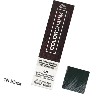 Wella Color Charm Demi-Permanent Haircolor - 1N (2/0) Black / 2 oz. Our 21 NEW Wella colorcharm Demi-Permanent shades offer shiny, healthy-looking color with less damage*. With a wide palette of Blonde, Red, Violet and deep Brunette shades, we have every color needed to create the look you desire. Love your current color but want to make it shine? Our Clear shade adds eye-catching gloss to any color. *vs. permanent color
