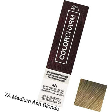 Wella Color Charm Demi-Permanent Haircolor - 7A (7/1) Medium Ash Blonde / 2 oz. Our 21 NEW Wella colorcharm Demi-Permanent shades offer shiny, healthy-looking color with less damage*. With a wide palette of Blonde, Red, Violet and deep Brunette shades, we have every color needed to create the look you desire. Love your current color but want to make it shine? Our Clear shade adds eye-catching gloss to any color. *vs. permanent color