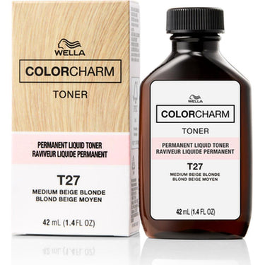 Wella Color Charm Liquid Toner - T-27 Medium Beige Blonde / 1.4 oz. Wella Color Charm Permanent Liquid Hair Toner with Liquidfuse Technology saturates, penetrates and fuses with the hair to deliver vibrant color that is exceptionally fade resistant. The extra mild formulation is ideal for creating delicate shades of blonde - like platinum and beige and neutralizing unwanted warmth after lightening. Great for toning pure double processed blondes.