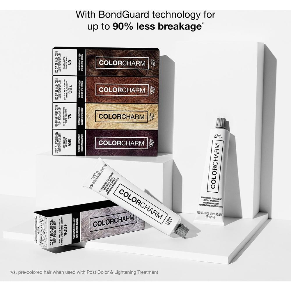 Wella Color Charm Permanent Cream Hair Color, 2 oz. Up your color game with the Wella Color Charm Permanent Cream Hair Color, a revolutionary formula designed to deliver vibrant, long-lasting color while prioritizing hair health. This advanced cream hair color is infused with BondGuard technology, which strengthens hair bonds, reduces breakage, and combats damage, ensuring your clients leave with hair that’s not only beautifully colored but also healthier and more resilient. Enriched with a blend of five nourishing lipids, Shea Butter, Jojoba Oil, and Acai Berry Extract, this formula deeply moisturizes, leaving hair soft, smooth, and radiant with shine. Whether you’re aiming for 100% gray coverage, a bold color transformation, or a subtle refresh, this product is your go-to solution for professional-grade results.