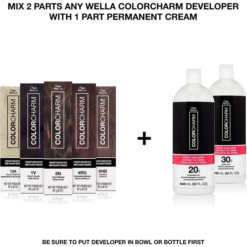 For best results, mix 1 part Wella Color Charm Permanent Cream Hair Color with 2 parts Wella Color Charm Developer (10, 20, 30, or 40 volume). Apply the mixture evenly to the hair and process for 30 minutes. For maximum gray coverage, high-lift shades, or vibrant reds, extend the processing time to 45 minutes. Rinse thoroughly and follow with a nourishing conditioner to lock in shine and softness.