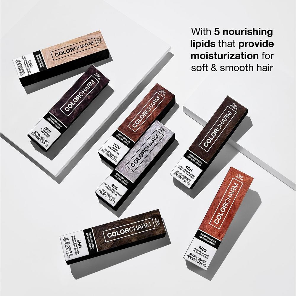 Wella Color Charm Permanent Cream Hair Color, 2 oz. Up your color game with the Wella Color Charm Permanent Cream Hair Color, a revolutionary formula designed to deliver vibrant, long-lasting color while prioritizing hair health. This advanced cream hair color is infused with BondGuard technology, which strengthens hair bonds, reduces breakage, and combats damage, ensuring your clients leave with hair that’s not only beautifully colored but also healthier and more resilient. Enriched with a blend of five nourishing lipids, Shea Butter, Jojoba Oil, and Acai Berry Extract, this formula deeply moisturizes, leaving hair soft, smooth, and radiant with shine. Whether you’re aiming for 100% gray coverage, a bold color transformation, or a subtle refresh, this product is your go-to solution for professional-grade results.