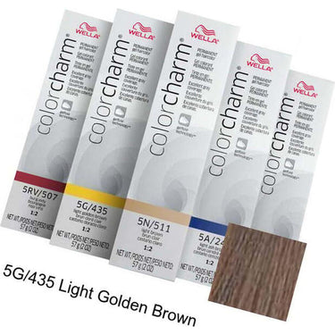 Wella Color Charm Permanent Gel Haircolor - 5G/435 Light Golden Brown / 2 oz. Color Charm is the haircolor that makes sense. It is easy to understand and formulate. Wella Color Charm Permanent Gel Haircolor provides the speed of liquid, conditioning and convenience of cream. Vibrant, long lasting, fade resistant results with Gelfuse™ Technology that saturates, penetrates and fuses with the hair to deliver vibrant color that is exceptionally fade resistant. Excellent gray coverage that covers the most resistant grays. Very predictable, the color you want is always the color you get. Versatility of use - bowl and brush or bottle and a translucent mixture for better control.