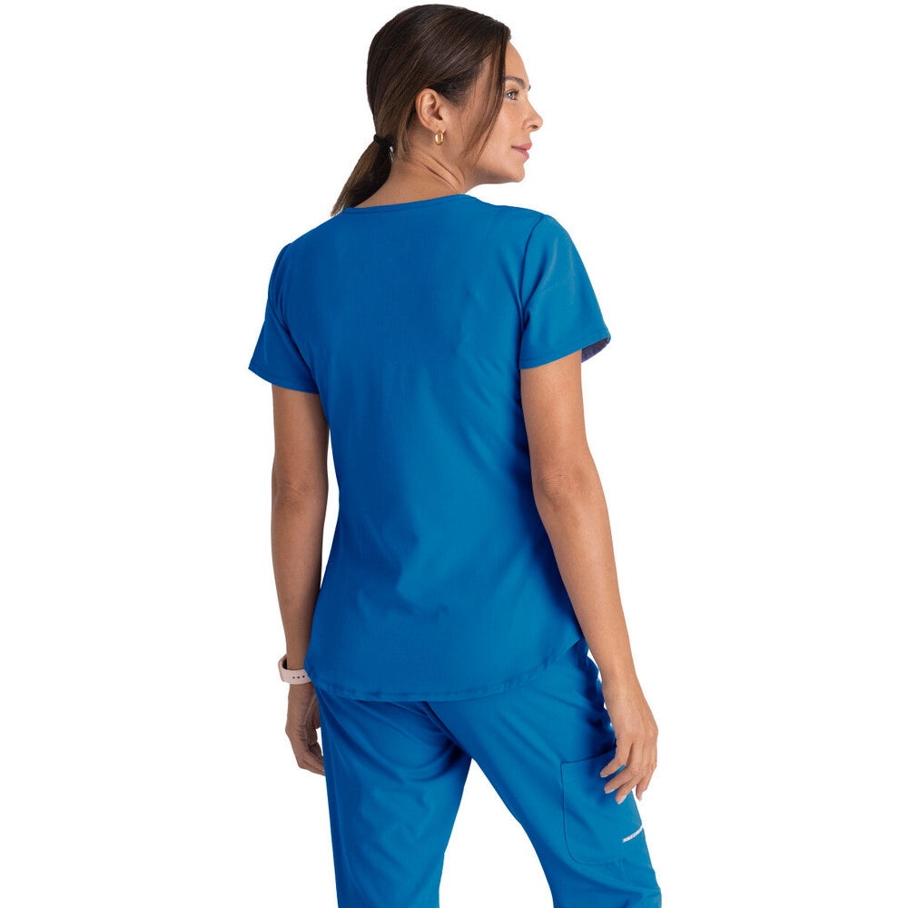 Designed with a modern fit and a shaped hem, the Breeze Scrub Top offers a flattering silhouette while providing the comfort you need during long hours of work. It's crafted from 4-way stretch fabric that wicks moisture away, keeping you cool and comfortable throughout your workday. But comfort doesn't mean compromising on style. With its v-neck design and three functional pockets, this scrub top is as stylish as it is practical.