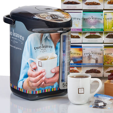 Zojirushi Water Boiler - 5 Liters with Two Leaves Custom Wrap. This Commercial Water Boiler & Warmer comes with branded decal. It is ideal for non-plumbed tea service. This 169 oz. capacity unit boils waterand keeps water hot at a set temperature for as long as it's plugged in. The optional QUICK TEMP mode brings water to either 195°F or 175°F without reaching a boil.